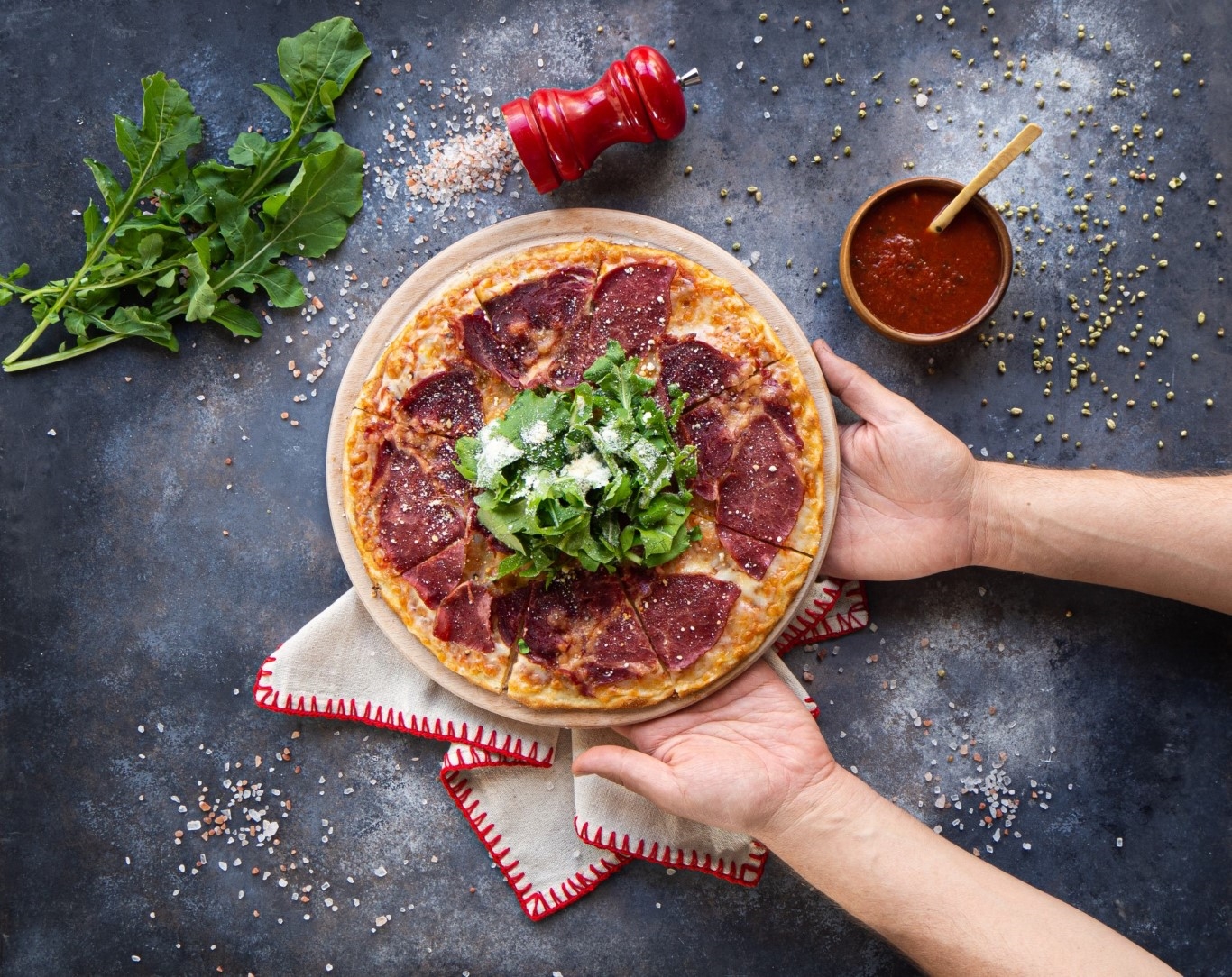 Domates sos, mozarella, füme antrikot, roka, parmesan